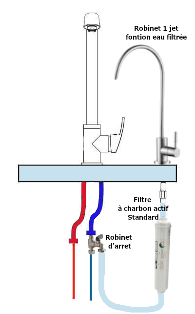 - Nécessite une petite installation (sous évier ou sur arrivée d’eau).